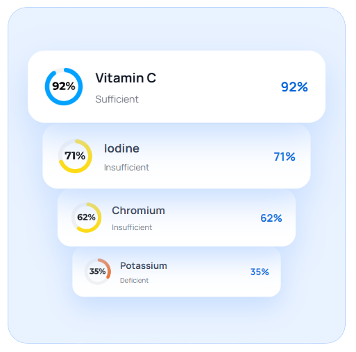 Your nutrient status is scored out of 100 and color-coded, so you can spot your biggest gaps at a glance. No lab coat required. Just answers.